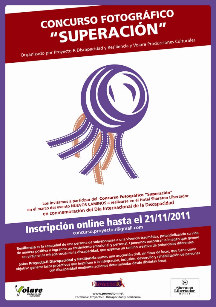 Proyecto-R Discapacidad y Resiliencia y Volare Producciones Culturales les invita a participar en el consurso de fotografía “Superación” en el marco del evento NUEVOS CAMINOS que se llevará acabo en el Hotel Sheraton Libertador el día 5 de diciembre de 18 a 20 hs. Con motivo de la conmemoración del Día Internacional de la Discapacidad. Las personas que deseen inscribirse pueden enviar sus fotografías hasta el día 24 de Noviembre del 2011.