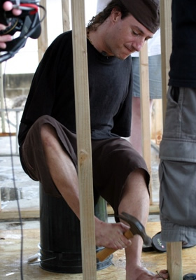 Mark, martillo al pie mostrando que se pueden hacer las cosas de forma diferente.